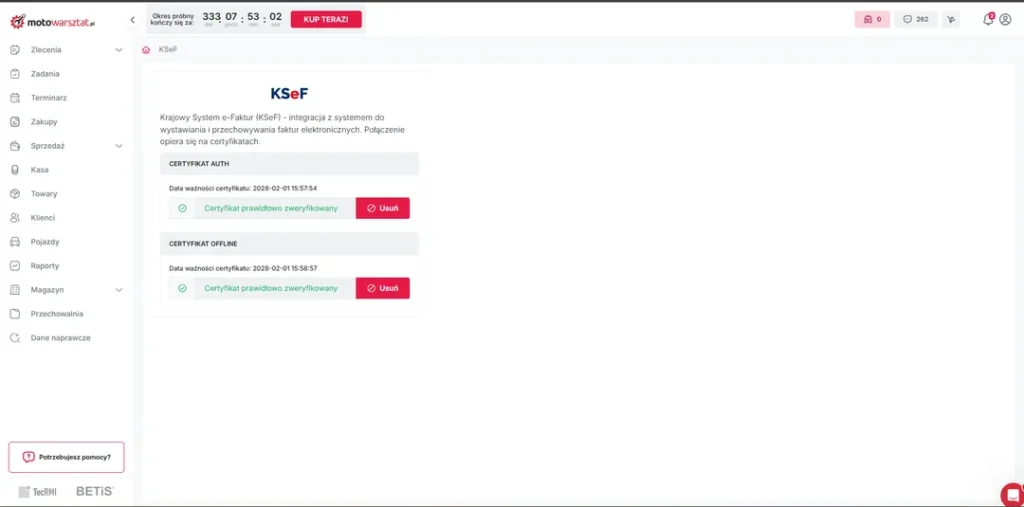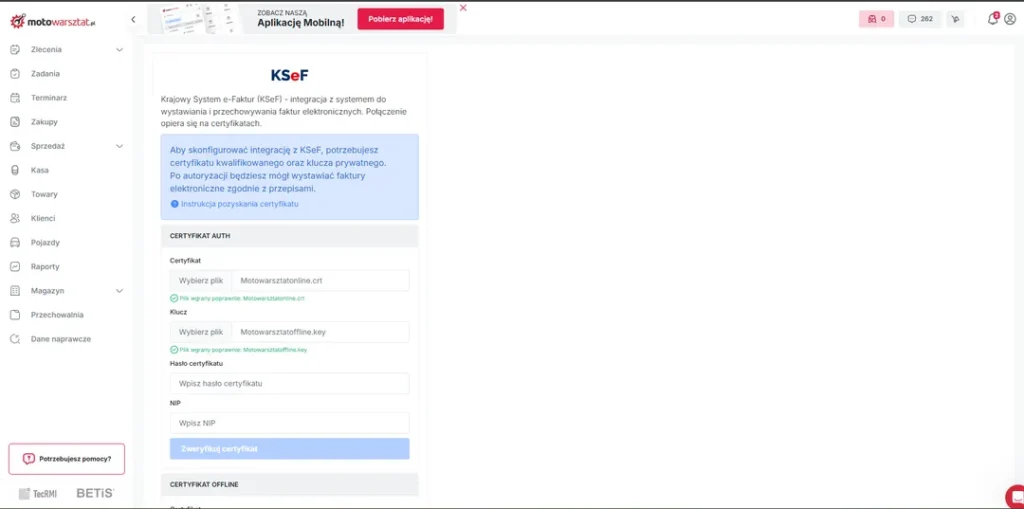 Aby integracja z KSeF działała poprawnie w każdej sytuacji, wymagany jest również certyfikat offline – służy on do podpisywania i wysyłki dokumentów wtedy, gdy KSeF jest chwilowo niedostępny lub działa w trybie awaryjnym. Dzięki temu Motowarsztat może bez przerw wystawiać faktury i zsynchronizować je z KSeF automatycznie, gdy połączenie zostanie przywrócone.