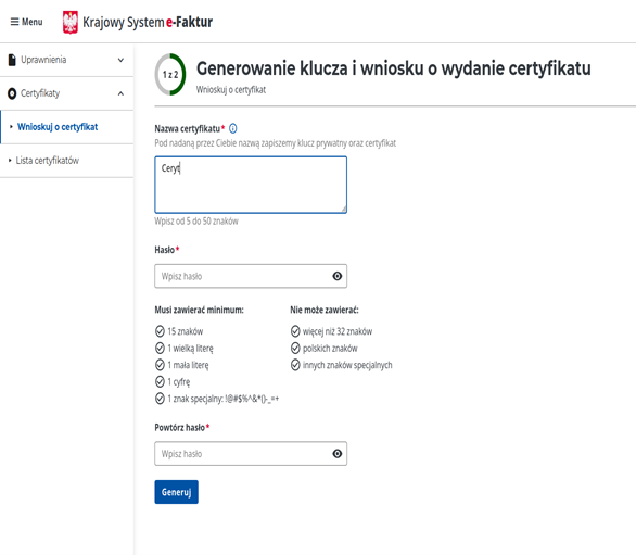 Po zalogowaniu przejdź do sekcji 'Certyfikaty’ i kliknij 'Wnioskuj o certyfikat’. Wprowadź nazwę certyfikatu (5-50 znaków) oraz ustaw hasło spełniające wymagania: minimum 15 znaków, 1 wielka litera, 1 mała litera, 1 cyfra, 1 znak specjalny (!@#$%^&*()-_=+), maksymalnie 32 znaki, bez polskich znaków. Potwierdź hasło i kliknij 'Generuj’. ZAPAMIĘTAJ TO HASŁO!
