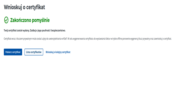 Po zakończeniu przetwarzania zobaczysz komunikat 'Zakończono pomyślnie’. Kliknij przycisk 'Pobierz certyfikat’, aby pobrać plik z certyfikatem i kluczem prywatnym. Zachowaj pobrany plik w bezpiecznym miejscu.