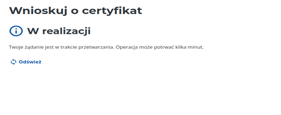 Po wysłaniu wniosku zobaczysz komunikat 'W realizacji’ – Twoje żądanie jest w trakcie przetwarzania. Operacja może potrwać kilka minut. Możesz odświeżyć stronę przyciskiem 'Odśwież’.